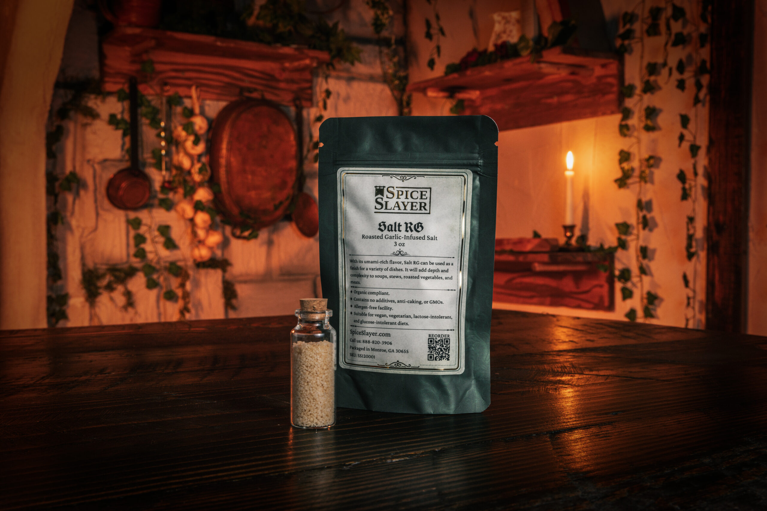 Salt RG, the roasted garlic-infused sea salt from Spice Slayer will slay your taste buds with its bold and delicious flavor. This unique finishing salt is the perfect addition to any dish, adding depth and complexity with just a sprinkle.